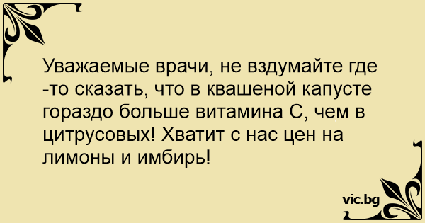 Уважаемые врачи, не вздумайте где-то сказать, что в квашеной капусте гораздо больше витамина С, чем в цитрусовых! Хватит с нас цен на лимоны и имбирь!