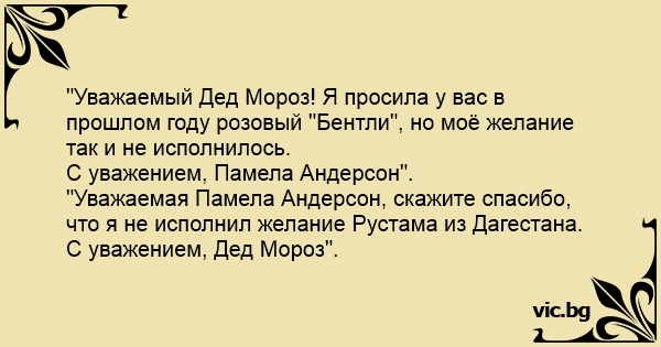 "Уважаемый Дед Мороз! Я просила у вас в прошлом году розовый "Бентли", но моё желание так и не исполнилось.
