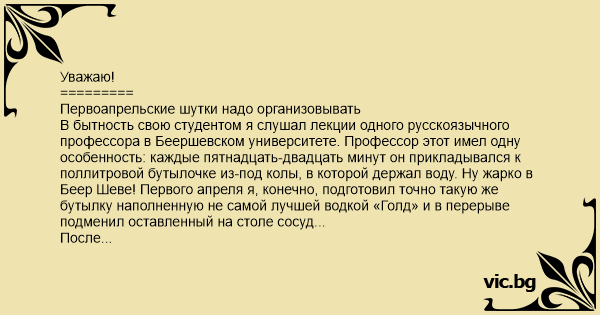 В бытность свою студентом я слушал лекции одного русскоязычного профессора в Беершевском университете. Профессор этот имел одну особенность: каждые пятнадцать-двадцать минут он прикладывался к поллитровой бутылочке из-под колы, в которой держал воду. Ну жарко в Беер Шеве! Первого апреля я, конечно, подготовил точно такую же бутылку наполненную не самой лучшей водкой «Голд» и в перерыве подменил оставленный на столе сосуд...