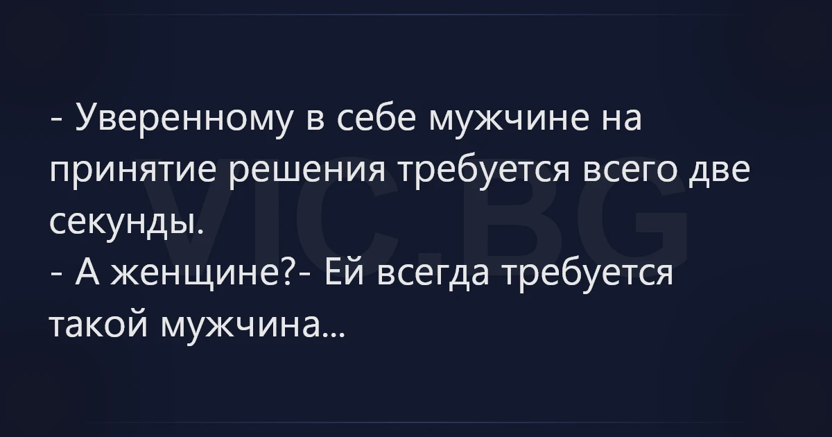 - Уверенному в себе мужчине на принятие решения требуется всего две секунды. - А женщине?- Ей всегда требуется такой мужчина...