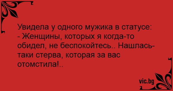 Увидела у одного мужика в статусе:<br />- Женщины, которых я когда-то обидел, не беспокойтесь.. Нашлась-таки стерва, которая за вас отомстила!..