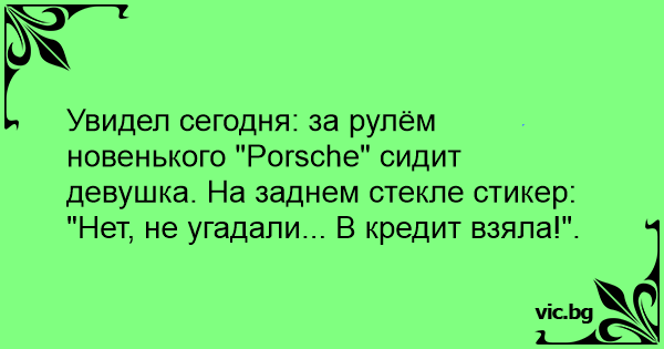 Увидел сегодня: за рулём новенького "Porsche" сидит девушка. На заднем стекле стикер: "Нет, не угадали... В кредит взяла!".