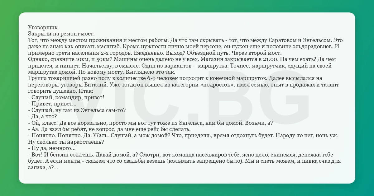 Группа товарищчей разно полу в количестве 6-9 человек подходит к конечной маршруток. Далее высылался на переговоры-уговоры Виталий. Уже тогда он вышел из категории «подросток», имел семью, опыт в продажах и талант говорить душевно. Итак: