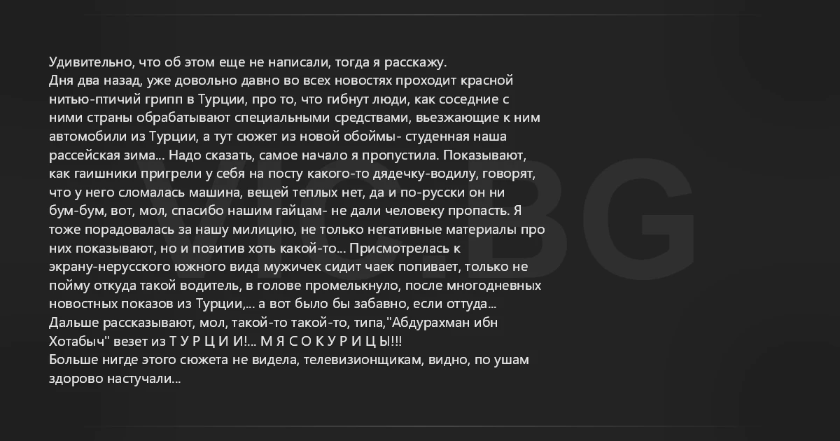Удивительно, что об этом еще не написали, тогда я расскажу. Дня два назад, уже довольно давно во всех новостях проходит красной нитью-птичий грипп в Турции, про то, что гибнут люди, как соседние с ними страны обрабатывают специальными средствами, вьезжающие к ним автомобили из Турции, а тут сюжет из новой обоймы- студенная наша рассейская зима... Надо сказать, самое начало я пропустила. Показывают, как гаишники пригрели у себя на посту какого-то дядечку-водилу, говорят, что у него сломалась машина, вещей теплых нет, да и по-русски он ни бум-бум, вот, мол, спасибо нашим гайцам- не дали человеку пропасть. Я тоже порадовалась за нашу милицию, не только негативные материалы про них показывают, но и позитив хоть какой-то... Присмотрелась к экрану-нерусского южного вида мужичек сидит чаек попивает, только не пойму откуда такой водитель, в голове промелькнуло, после многодневных новостных показов из Турции,... а вот было бы забавно, если оттуда... Дальше рассказывают, мол, такой-то такой-то, типа,"Абдурахман ибн Хотабыч" везет из Т У Р Ц И И!... М Я С О К У Р И Ц Ы!!! Больше нигде этого сюжета не видела, телевизионщикам, видно, по ушам здорово настучали...