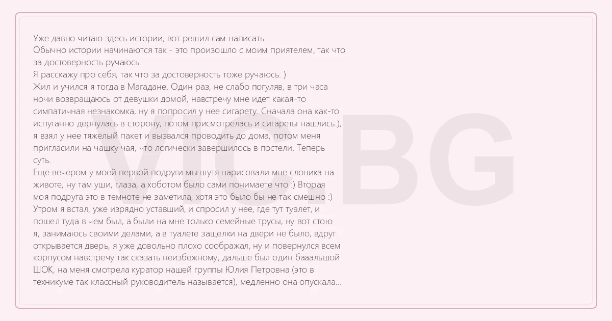 Уже давно читаю здесь истории, вот решил сам написать. Обычно истории начинаются так - это произошло с моим приятелем, так что за достоверность ручаюсь. Я расскажу про себя, так что за достоверность тоже ручаюсь: ) Жил и учился я тогда в Магадане. Один раз, не слабо погуляв, в три часа ночи возвращаюсь от девушки домой, навстречу мне идет какая-то симпатичная незнакомка, ну я попросил у нее сигарету. Сначала она как-то испуганно дернулась в сторону, потом присмотрелась и сигареты нашлись:), я взял у нее тяжелый пакет и вызвался проводить до дома, потом меня пригласили на чашку чая, что логически завершилось в постели. Теперь суть. Еще вечером у моей первой подруги мы шутя нарисовали мне слоника на животе, ну там уши, глаза, а хоботом было сами понимаете что :) Вторая моя подруга это в темноте не заметила, хотя это было бы не так смешно :) Утром я встал, уже изрядно уставший, и спросил у нее, где тут туалет, и пошел туда в чем был, а были на мне только семейные трусы, ну вот стою я, занимаюсь своими делами, а в туалете защелки на двери не было, вдруг открывается дверь, я уже довольно плохо соображал, ну и повернулся всем корпусом навстречу так сказать неизбежному, дальше был один бааальшой ШОК, на меня смотрела куратор нашей группы Юлия Петровна (это в техникуме так классный руководитель называется), медленно она опускала взгляд ниже, увидела слоника и спрашивает меня: - Алексей, ты что здесь делаешь??? Я не нашел ничего лучше как сказать - живу я здесь, посмотрел на хозяйство в руке, и говорю: а это слоник, он тоже будет жить с вами. Я и раньше был самым нелюбимым студентом, а за соблазнение дочери из техникума меня конечно выгнали, о чем я ни капли не расстраиваюсь, так как поступил в Санкт-Петербургский Торгово-Экономический институт, правда оттуда меня тоже выгнали. Будет настроение расскажу :) Lirik Lirr@mail.ru