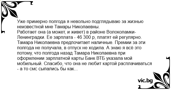 Работает она (а может, и живет) в районе Волоколамки-Ленинградки. Ее зарплата - 46 300 р, платят ей регулярно. Тамара Николаевна предпочитает наличные. Премии за эти полгода не получала, в отпуск не ходила. А знаю я всё это потому, что полгода назад Тамара Николаевна при оформлении зарплатной карты Банк ВТБ указала мой мобильный. Спасибо, что она не любит картой расплачиваться - а то смс сыпались бы как из рога изобилия. Хотя вот буквально на днях Тамара Николаевна впервые пыталась что-то оплатить в Пятерочке на 629,27 р., но операция была отклонена. И то верно, откуда же Тамаре Николаевне знать, сколько у нее средств на счету, если ей ни смс не приходят, ни в мобильный банк она не может попасть. А было у нее на карте во время злополучного похода в Пятерочку 82 рубля. И восемь копеек.