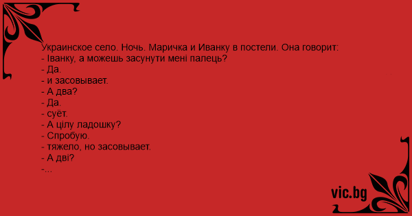 Украинское село. Ночь. Маричка и Иванку в постели. Она говорит: