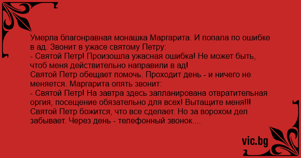 Умерла благонравная монашка Маргарита. И попала по ошибке в ад. Звонит в ужасе святому Петру: