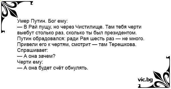 — В Рай пущу, но через Чистилище. Там тебя черти выебут столько раз, сколько ты был президентом.
