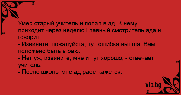 Умер старый учитель и попал в ад. К нему приходит через неделю Главный смотритель ада и говорит: