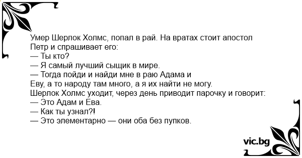 Умер Шерлок Холмс, попал в рай. На вратах стоит апостол Петр и спрашивает его: