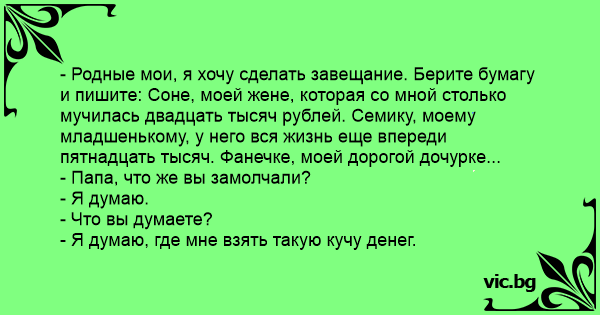 - Родные мои, я хочу сделать завещание. Берите бумагу и пишите: Соне, моей жене, которая со мной столько мучилась двадцать тысяч рублей. Семику, моему младшенькому, у него вся жизнь еще впереди пятнадцать тысяч. Фанечке, моей дорогой дочурке...