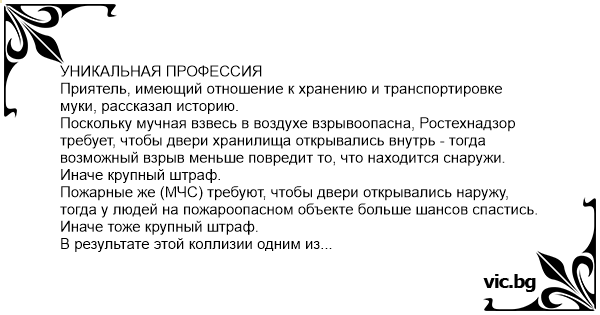 Приятель, имеющий отношение к хранению и транспортировке муки, рассказал историю. Поскольку мучная взвесь в воздухе взрывоопасна, Ростехнадзор требует, чтобы двери хранилища открывались внутрь - тогда возможный взрыв меньше повредит то, что находится снаружи. Иначе крупный штраф. Пожарные же (МЧС) требуют, чтобы двери открывались наружу, тогда у людей на пожароопасном объекте больше шансов спастись. Иначе тоже крупный штраф. В результате этой коллизии одним из важнейших направлений деятельности службы безопасности одной из российских зерновых компаний стало выяснение, когда придёт следующая инспекция и из какого надзорного ведомства. А в штатном расписании появилась уникальная рабочая специальность - экстренный перевешивальщик дверей.