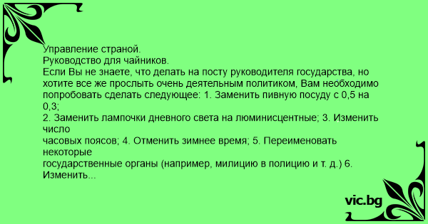 Управление страной. Руководство для чайников. Если Вы не знаете, что делать на посту руководителя государства, но хотите все же прослыть очень деятельным политиком, Вам необходимо попробовать сделать следующее: 1. Заменить пивную посуду с 0,5 на 0,3; 2. Заменить лампочки дневного света на люминисцентные; 3. Изменить число часовых поясов; 4. Отменить зимнее время; 5. Переименовать некоторые государственные органы (например, милицию в полицию и т. д.) 6. Изменить границы областей и городов, перенести столицу или федеральные учреждения; 7. Отдать некоторые участки территории соседним странам (острова на Амуре - Китаю, морской шельф - Норвегии и т. д.) Пользы от всех этих действий никакой, один только вред, зато Вы прослывете великим реформатором.