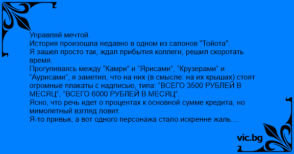 Но ошибки быть не могло: на белоснежной Камри с кожаным салоном было написано, что та готова стать его и отдаваться ему каждый день всего за “Трипицот в месяц”.
