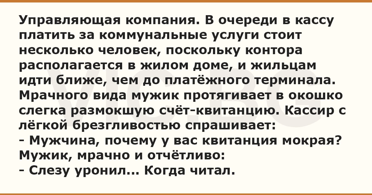 Мрачного вида мужик протягивает в окошко слегка размокшую счёт-квитанцию. Кассир с лёгкой брезгливостью спрашивает: