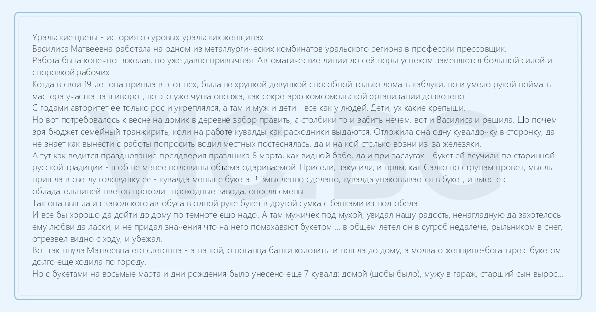 Уральские цветы - история о суровых уральских женщинах Василиса Матвеевна работала на одном из металлургических комбинатов уральского региона в профессии прессовщик. Работа была конечно тяжелая, но уже давно привычная. Автоматические линии до сей поры успехом заменяются большой силой и сноровкой рабочих. Когда в свои 19 лет она пришла в этот цех, была не хрупкой девушкой способной только ломать каблуки, но и умело рукой поймать мастера участка за шиворот, но это уже чутка опозжа, как секретарю комсомольской организации дозволено. С годами авторитет ее только рос и укреплялся, а там и муж и дети - все как у людей. Дети, ух какие крепыши. Но вот потребовалось к весне на домик в деревне забор править, а столбики то и забить нечем. вот и Василиса и решила. Шо почем зря бюджет семейный транжирить, коли на работе кувалды как расходники выдаются. Отложила она одну кувалдочку в сторонку, да не знает как вынести с работы попросить водил местных постеснялась. да и на кой столько возни из-за железяки. А тут как водится празднование преддверия праздника 8 марта, как видной бабе, да и при заслугах - букет ей всучили по старинной русской традиции - шоб не менее половины объема одариваемой. Присели, закусили, и прям, как Садко по струнам провел, мысль пришла в светлу головушку ее - кувалда меньше букета!!! Змысленно сделано, кувалда упаковывается в букет, и вместе с обладательницей цветов проходит проходные завода, опосля смены. Так она вышла из заводского автобуса в одной руке букет в другой сумка с банками из под обеда. И все бы хорошо да дойти до дому по темноте ешо надо. А там мужичек под мухой, увидал нашу радость, ненагладную да захотелось ему любви да ласки, и не придал значения что на него помахавают букетом ... в общем летел он в сугроб недалече, рыльником в снег, отрезвел видно с ходу, и убежал. Вот так пнула Матвеевна его слегонца - а на кой, о поганца банки колотить. и пошла до дому, а молва о женщине-богатыре с букетом долго еще ходила по городу. Но с букетами на восьмые марта и дни рождения было унесено еще 7 кувалд: домой (шобы было), мужу в гараж, старший сын вырос подрос и ему надо, младшой ... а потом поставили на проходных металлодетекторы.