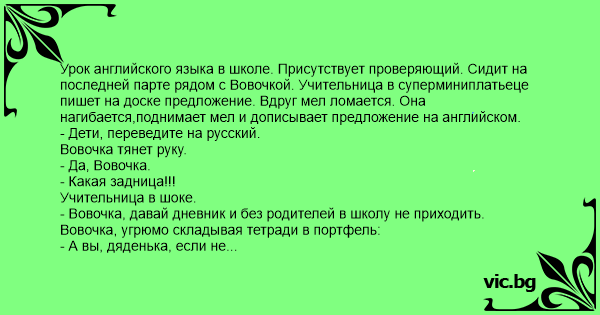 Урок английского. На задней парте устроился мужик - проверяющий из РОНО. Молодая учительница пишет на доске английскую фразу и просит учеников перевести. Класс молчит, и вдруг с предпоследней парты руку тянет Вовочка.