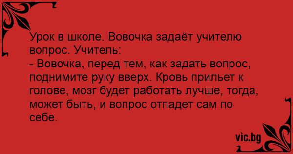 - Вовочка, перед тем, как задать вопрос, поднимите руку вверх. Кровь прильет к голове, мозг будет работать лучше, тогда, может быть, и вопрос отпадет сам по себе.
