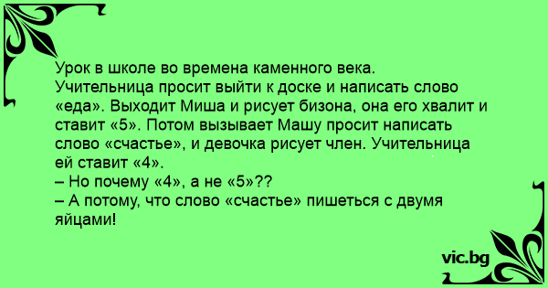 Учительница просит выйти к доске и написать слово «еда». Выходит Миша и рисует бизона, она его хвалит и ставит «5». Потом вызывает Машу просит написать слово «счастье», и девочка рисует члeн. Учительница ей ставит «4».