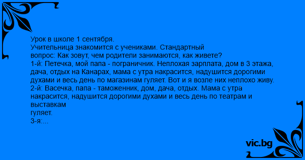 1-й: Петечка, мой папа - пограничник. Неплохая зарплата, дом в 3 этажа,