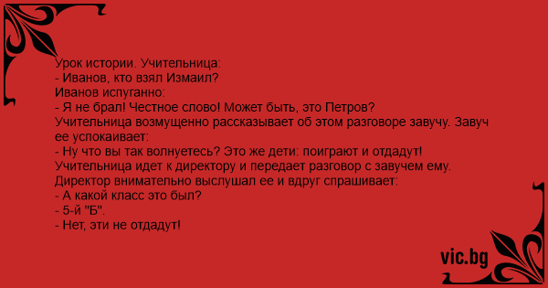 Учительница идет к директору и передает разговор с завучем ему. Директор внимательно выслушал ее и вдруг спрашивает:
