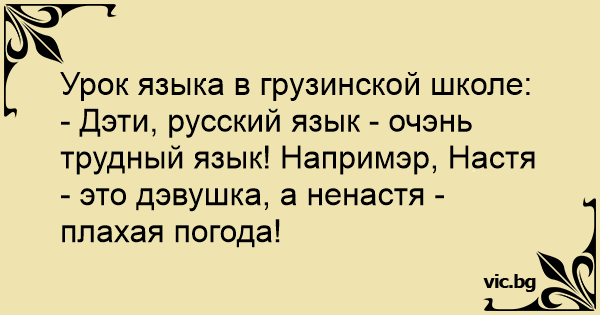 - Дэти, русский язык - очэнь трудный язык! Напримэр, Настя - это дэвушка, а ненастя - плахая погода!