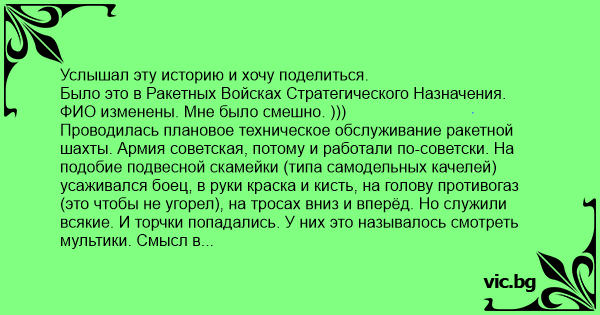 Проводилась плановое техническое обслуживание ракетной шахты. Армия советская, потому и работали по-советски. На подобие подвесной скамейки (типа самодельных качелей) усаживался боец, в руки краска и кисть, на голову противогаз (это чтобы не угорел), на тросах вниз и вперёд. Но служили всякие. И торчки попадались. У них это называлось смотреть мультики. Смысл в том, что в шахте довольно душно. И солдат, чтобы не угореть во время плановой работы, то бишь покраски того-сего, в противогазе-то защищён. А вот если его сняять… Ну, видели вы поди таких личностей на улице. В руках полиэтиленовый пакет, в пакете клей и глубокий вдох-выдох. Так и там. Отсоедини шланг противогаза и дыши «на здоровье».