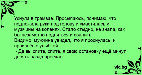Уснула в трамвае. Просыпаюсь, понимаю, что подложила руки под голову и умастилась у мужчины на коленях. Стало стыдно, не знала, как бы незаметно подняться и свалить.