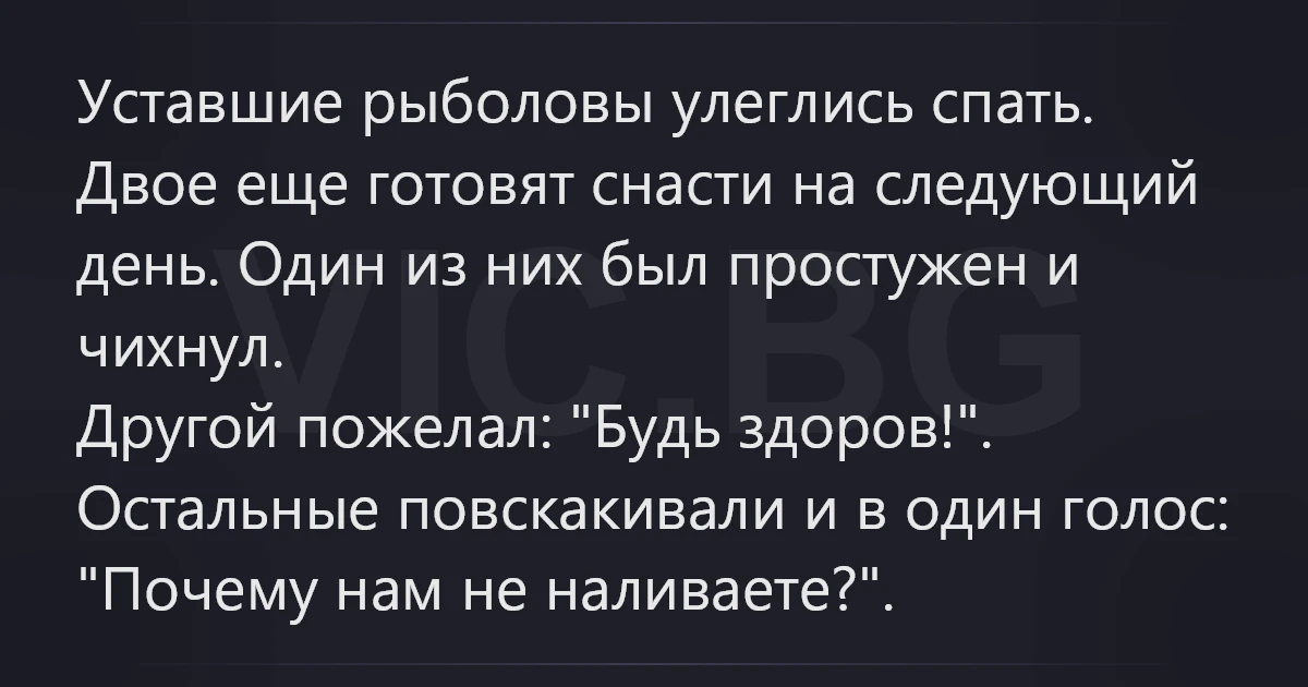 Уставшие рыболовы улеглись спать. Двое еще готовят снасти на следующий день. Один из них был простужен и чихнул. Другой пожелал: "Будь здоров!". Остальные повскакивали и в один голос: "Почему нам не наливаете?".