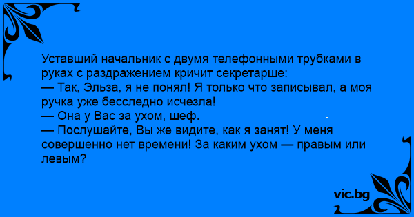 — Послушайте, Вы же видите, как я занят! У меня совершенно нет времени! За каким ухом — правым или левым?