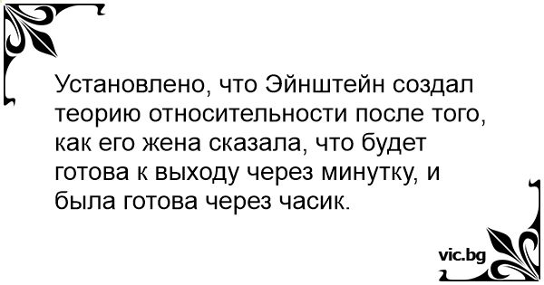 Установлено, что Эйнштейн создал теорию относительности после того, как его жена сказала, что будет готова к выходу через минутку, и была готова через часик.
