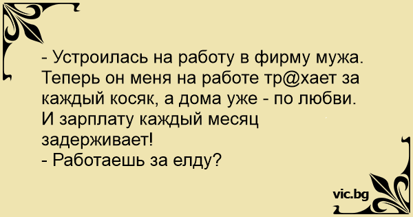 - Устроилась на работу в фирму мужа.<br />Теперь он меня на работе тр@хает за каждый косяк, а дома уже - по любви. И зарплату каждый месяц задерживает!<br />- Работаешь за елду?