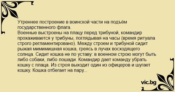 Утреннее построение в воинской части на подъём государственного флага. Военные выстроены на плацу перед трибуной, командир прохаживается у трибуны, поглядывая на часы (время ритуала строго регламентировано). Между строем и трибуной сидит рыжая мимимишная кошка, греясь в лучах восходящего солнца. Сидит кошка не по уставу: в военном строю могут быть либо собаки, либо лошади. Командир дает команду убрать кошку с плаца. Из строя выходит один из офицеров и шугает кошку. Кошка отбегает на пару метров и замирает, греясь дальше, офицер опять идет к кошке, но та отбегает дальше в сторону трибуны и снова замирает, глядя в сторону своего гонителя. Командир подходит к кошке сзади и нависает над ней. Кошка поворачивает голову и смотрит на командира снизу вверх, ничуть не боясь. Командир берет кошку на руки и уносит её за трибуну. В строю раздаются смешки и предположения о способах упокоения животинки. Проходит полминуты. Из-за трибуны спокойно выходит кошка, садится перед трибуной и продолжает греться на солнышке. В строю всеобщий смех и предположения о незавидной судьбе командира. Расцарапанное лицо – лишь самая безобидная версия. Рисуются картины увечий и инвалидности командира. В общем, страшнее кошки зверя нет. …закончилось всё хорошо, кошку убрали за строй, флаг подняли, гимн спели.