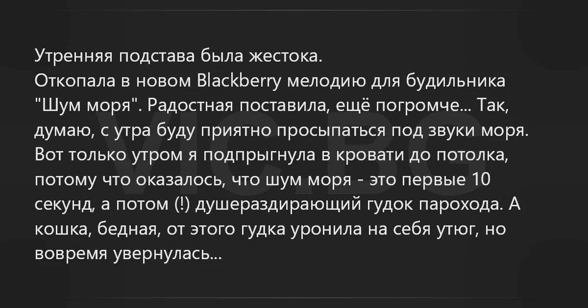 Утренняя подстава была жестока. Откопала в новом Blackberry мелодию для будильника "Шум моря". Радостная поставила, ещё погромче... Так, думаю, с утра буду приятно просыпаться под звуки моря. Вот только утром я подпрыгнула в кровати до потолка, потому что оказалось, что шум моря - это первые 10 секунд, а потом (!) душераздирающий гудок парохода. А кошка, бедная, от этого гудка уронила на себя утюг, но вовремя увернулась...