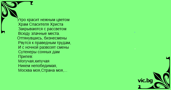Утро красит нежным цветом Храм Спасителя Христа Закрываются с рассветом Всюду злачные места.