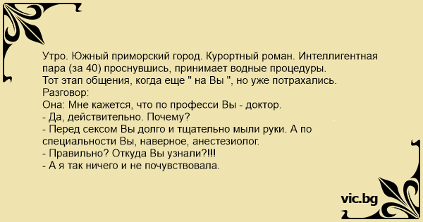 - Перед сексом Вы долго и тщательно мыли руки. А по специальности Вы, наверное, анестезиолог.