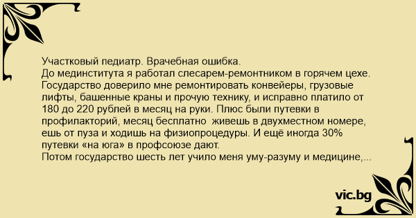 А потом меня послали на участок в детской поликлинике, доверили жизнь 1200 (это ровно в полтора раза больше средней нормы) детей и стали платить 120 рублей, на руки 106. Про любые халявные путевки я забыл до конца работы в медицине...да и вообще на всю жизнь)