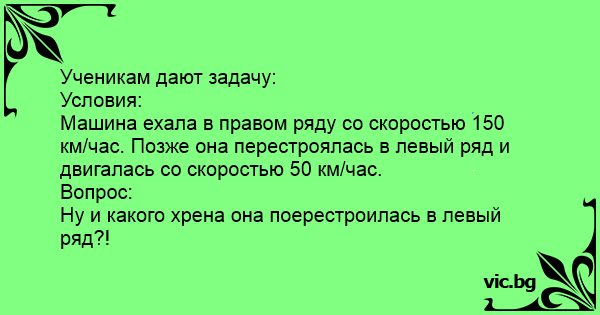 Машина ехала в правом ряду со скоростью 150 км/час. Позже она перестроялась в левый ряд и двигалась со скоростью 50 км/час.