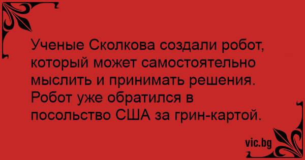 Ученые Сколкова создали робот, который может самостоятельно мыслить и принимать решения.<br />Робот уже обратился в посольство США за грин-картой.