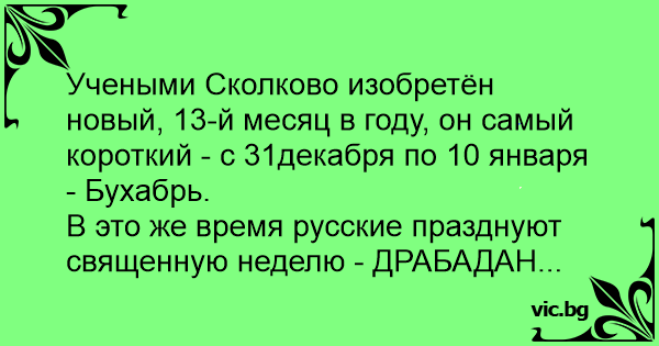 Учеными Сколково изобретён новый, 13-й месяц в году, он самый короткий - с 31декабря по 10 января - Бухабрь.