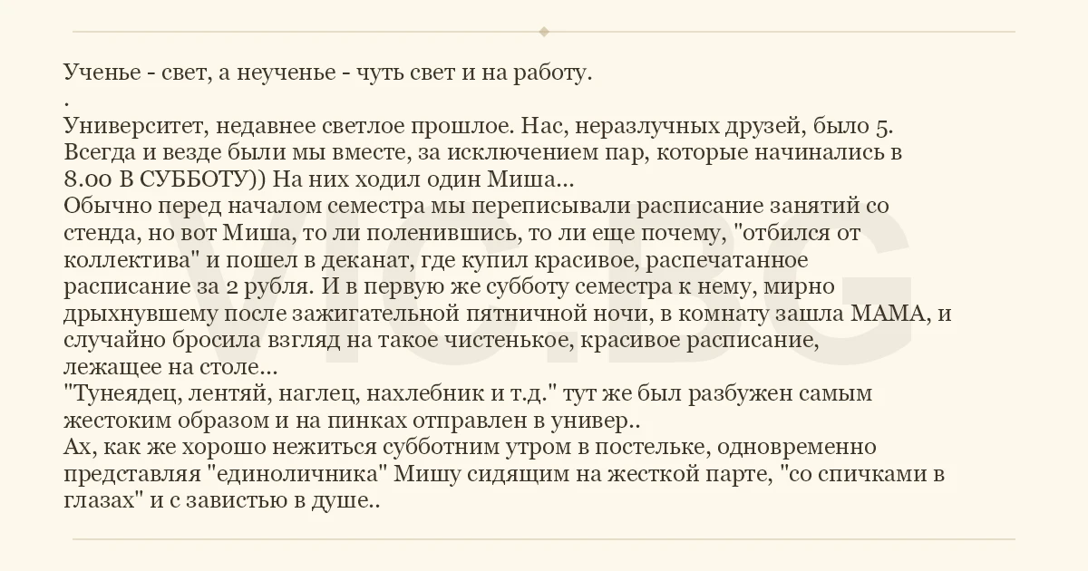 Ученье - свет, а неученье - чуть свет и на работу. . Университет, недавнее светлое прошлое. Нас, неразлучных друзей, было 5. Всегда и везде были мы вместе, за исключением пар, которые начинались в 8.00 В СУББОТУ)) На них ходил один Миша... Обычно перед началом семестра мы переписывали расписание занятий со стенда, но вот Миша, то ли поленившись, то ли еще почему, "отбился от коллектива" и пошел в деканат, где купил красивое, распечатанное расписание за 2 рубля. И в первую же субботу семестра к нему, мирно дрыхнувшему после зажигательной пятничной ночи, в комнату зашла МАМА, и случайно бросила взгляд на такое чистенькое, красивое расписание, лежащее на столе... "Тунеядец, лентяй, наглец, нахлебник и т.д." тут же был разбужен самым жестоким образом и на пинках отправлен в универ.. Ах, как же хорошо нежиться субботним утром в постельке, одновременно представляя "единоличника" Мишу сидящим на жесткой парте, "со спичками в глазах" и с завистью в душе..