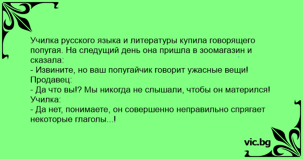 Училка русского языка и литературы купила говорящего попугая. На следущий день она пришла в зоомагазин и сказала: