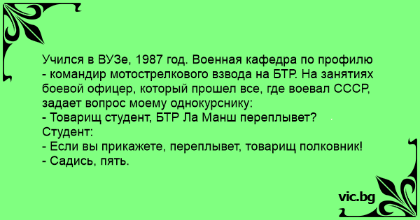 Учился в ВУЗе, 1987 год. Военная кафедра по профилю - командир мотострелкового взвода на БТР. На занятиях боевой офицер, который прошел все, где воевал СССР, задает вопрос моему однокурснику: