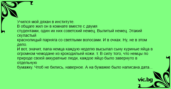 И вот, значит, папа немца каждую неделю высылал сыну куриные яйца в