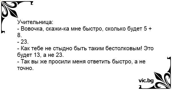 - Вовочка, скажи-ка мне быстро, сколько будет 5 + 8.
