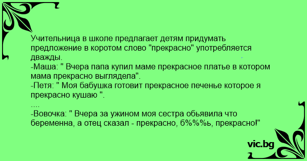 -Петя: " Моя бабушка готовит прекрасное печенье которое я прекрасно кушаю ".