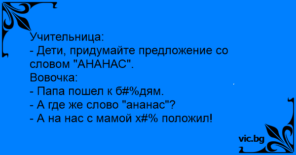 Марья Ивановна попросила учеников составить предложение со словом ананас. Маша: - Мне папа купил ананас. Петя: - Мама принесла ананас. Вовочка: - Дед вчера получил пенсию и пропил ее. Учительница: - Ну а где же тут слово ананас? Вовочка: - А на нас он х@й забил!