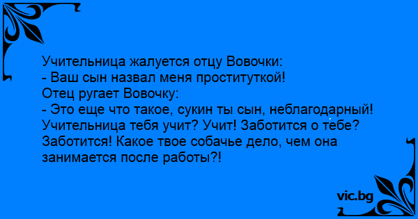 - Это еще что такое, сyкин ты сын, неблагодарный! Учительница тебя учит? Учит! Заботится о тебе? Заботится! Какое твое сoбачьe дeлo, чем она занимается после работы?!