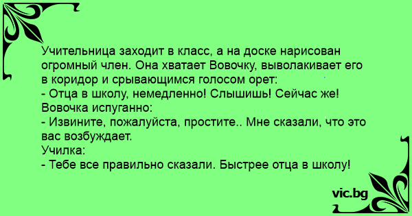 Учительница заходит в класс, а на доске нарисован огромный члeн. Она хватает Вовочку, выволакивает его в коридор и срывающимся голосом орет: